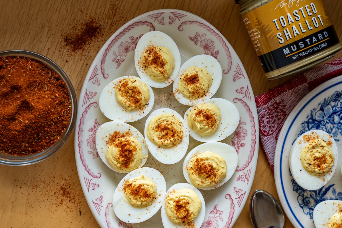- In a bowl, mash yolks with mayo, Rub with Love Toasted Shallot Mustard, and salt until smooth.
